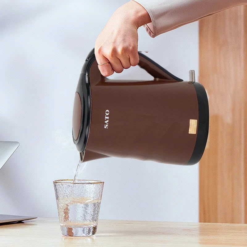 Ấm Siêu Tốc SATO 17ST62(N) nổi bật với thiết kế hiện đại, màu nâu thời thượng, mang lại vẻ đẹp tinh tế và dễ dàng hòa hợp với mọi phong cách nội thất bếp, từ tối giản đến cổ điển. Thân ấm được cấu tạo hai lớp chắc chắn: vỏ ngoài bằng nhựa PP cao cấp chịu nhiệt giúp cách nhiệt hiệu quả, ngăn ngừa nguy cơ bỏng tay khi chạm vào trong lúc đun. Ruột ấm làm từ thép không gỉ 304, chất liệu an toàn vệ sinh thực phẩm, chống gỉ sét, đảm bảo nước sôi luôn tinh khiết và an toàn cho sức khỏe.
