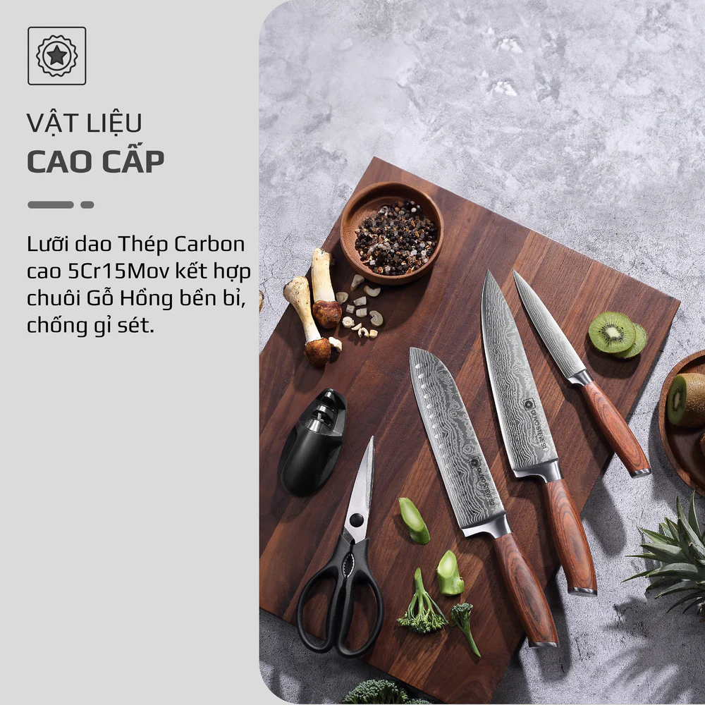 Lưỡi dao làm từ vật liệu thép Carbon cao 5Cr15Mov cứng cáp, đảm bảo độ sáng bóng và sắc bén. Chất liệu này bền đẹp theo thời gian, chống gỉ sét và tiếp xúc an toàn với thực phẩm.Chuôi dao làm bằng chất liệu gỗ hồng vừa có tính thẩm mỹ cao vừa tăng độ bền cho sản phẩm. Công việc nấu ăn sẽ cần tiếp xúc với nước nên ưu điểm chuôi gỗ hồng là chống ẩm, không mủn khi gặp nước như các loại gỗ thông thường.