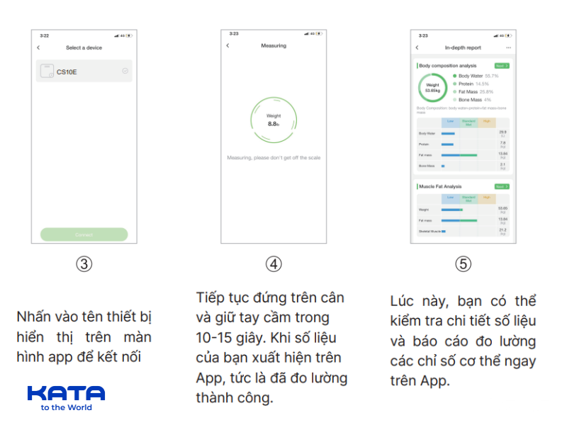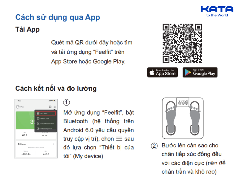 Sau đây là cách đọc chỉ số, hướng dẫn tư thế đứng và hướng dẫn kết nối app Feelfit của cân điện tử KATA CS10E mà người dùng nên tham khảo trước khi sử dụng: