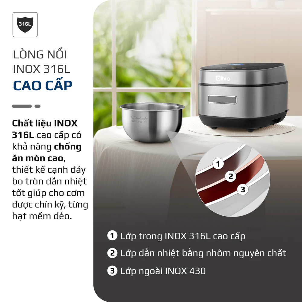 1.LÒNG NỒI INOX 316L CAO CẤP AN TOÀNMột trong những yếu tố quan trọng nhất khi chọn nồi cơm điện chính là chất liệu lòng nồi, bởi nó ảnh hưởng trực tiếp đến sức khỏe và hương vị món ăn. Nồi cơm điện cao tầnOLIVO RC900IHsử dụng lòng nồi làm từINOX 316L, loại vật liệu cao cấp có độ bền vượt trội, chống ăn mòn và chịu nhiệt cực kỳ tốt.