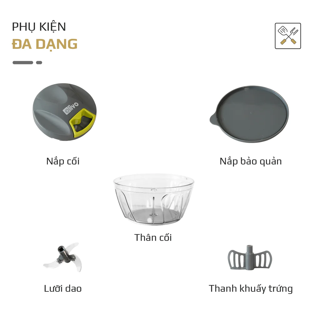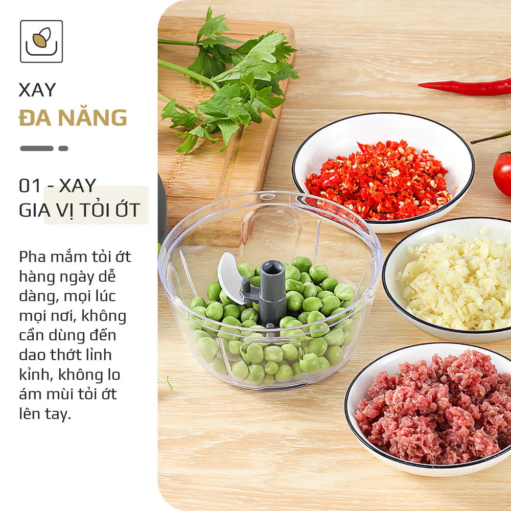 1. ĐA CHỨC NĂNG Xay gia vị tỏi ớt dễ dàng, bỏ vào máy kéo vài lần là xong. Không cần dùng dao thớt lỉnh kỉnh và cũng không lo tỏi ớt ám mùi vào dụng cụ hay dính vào tay. Thực sự là một dụng cụ nhỏ mà thiết thực cho chị em vô cùng. Ngoài xay tỏi ớt, máy còn có thể xay thịt, cá, tôm, rau củ… với lượng vừa phải rất hữu dụng cho việc mẹ bỉm sữa sơ chế đồ ăn dặm cho con. Chỉ một vật dụng nhỏ thôi, nhưng sẽ khiến mẹ bỉm thoải mái hơn trong việc chuẩn bị đồ ăn dặm hàng ngày cho con. Sử dụng không cần cắm điện, đa năng tiện lợi dùng linh hoạt mọi lúc mọi nơi. 2. DUNG TÍCH CỐI XAY 400ML Hỗ trợ tối đa khi bạn cần xay với lượng nhỏ vừa phải nếu bỏ máy to thì không đủ lượng để xay. Ví dụ xay tỏi ớt làm mắm chua ngọt, xay chút thịt, rau củ để làm đồ ăn dặm cho con. Thì dung tích của chiếc máy này rất hợp lý, thiết kế nhỏ gọn sử dụng vô cùng linh hoạt. Không phải lỉnh kỉnh dao thớt sau đó lại phải dọn rửa giúp chị em tiết kiệm thời gian, công sức. 3. LƯỠI DAO 3 TẦNG SẮC BÉN Hoạt động bằng phương pháp xoay và ba lưỡi dao bằng thép không gỉ sắc bén. Lực băm nghiền mạnh giúp xay gọn mọi loại nguyên liệu như tỏi, ớt, thịt, rau củ, tôm, cá… Thiết kế 3 tầng giúp lưỡi dao có thể tiếp xúc với thực phẩm tốt nhất đem lại hiệu quả tối ưu. 4. PHỤ KIỆN ĐA DẠNG Tích hợp thêm que đánh trứng thông minh giúp việc đánh trứng đơn giản hơn bao giờ hết. Không phải lỉnh kỉnh nhiều dụng cụ, không sợ đánh trứng bắn ra ngoài rồi phải dọn rửa mất thời gian. Đóng kín nắp máy, kéo rẹt rẹt vài lần là trứng được đánh bông và sẵn sàng chế biến. 5. DÂY KÉO CHẮC CHẮN, QUAI CẦM DỄ THAO TÁC KHÔNG ĐAU TAY Bộ phận quan trọng nhất giúp máy hoạt động hiệu quả là dây kéo, khi bạn kéo dây nhiều lần và nhanh thì máy xay càng khỏe. Thiết kế thân thiện với người dùng, quay cầm dễ thao tác sử dụng không gây đau tay. 6. VẬT LIỆU CAO CẤP, AN TOÀN TUYỆT ĐỐI Cối máy bằng nhựa PP cao cấp đã được kiểm định là vật liệu không màu, không mùi, an toàn cho sức khỏe. Ngoài ra, chất liệu nhựa trong suốt, dễ dàng kiểm soát thành phẩm theo ý. 7. DỄ DÀNG THÁO LẮP, VỆ SINH Thiết kế nhỏ gọn, thông minh giúp việc tháo lắp dễ dàng trong tích tắc. Dễ dàng rửa sạch dưới vòi nước, có thể dùng thêm các chất tẩy thông thường nếu cần để làm sạch lòng cối. Lưỡi dao rất sắc bén, chú ý khi vệ sinh để tránh bị đứt tay.