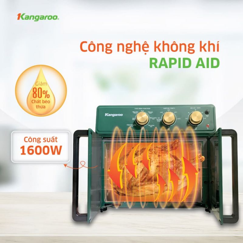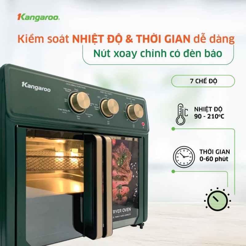 Với phương châm “tối giản”, Lò chiên 25L Kangaroo KG25AF1A giúp người dùng tiết kiệm tiền và không gian bếp khi thay thế 9 loại thiết bị bếp như lò vi sóng rã đông, nồi chiên, lò nướng, máy nướng Pizza, máy nướng bánh mì, máy làm bỏng, máy ủ sữa…