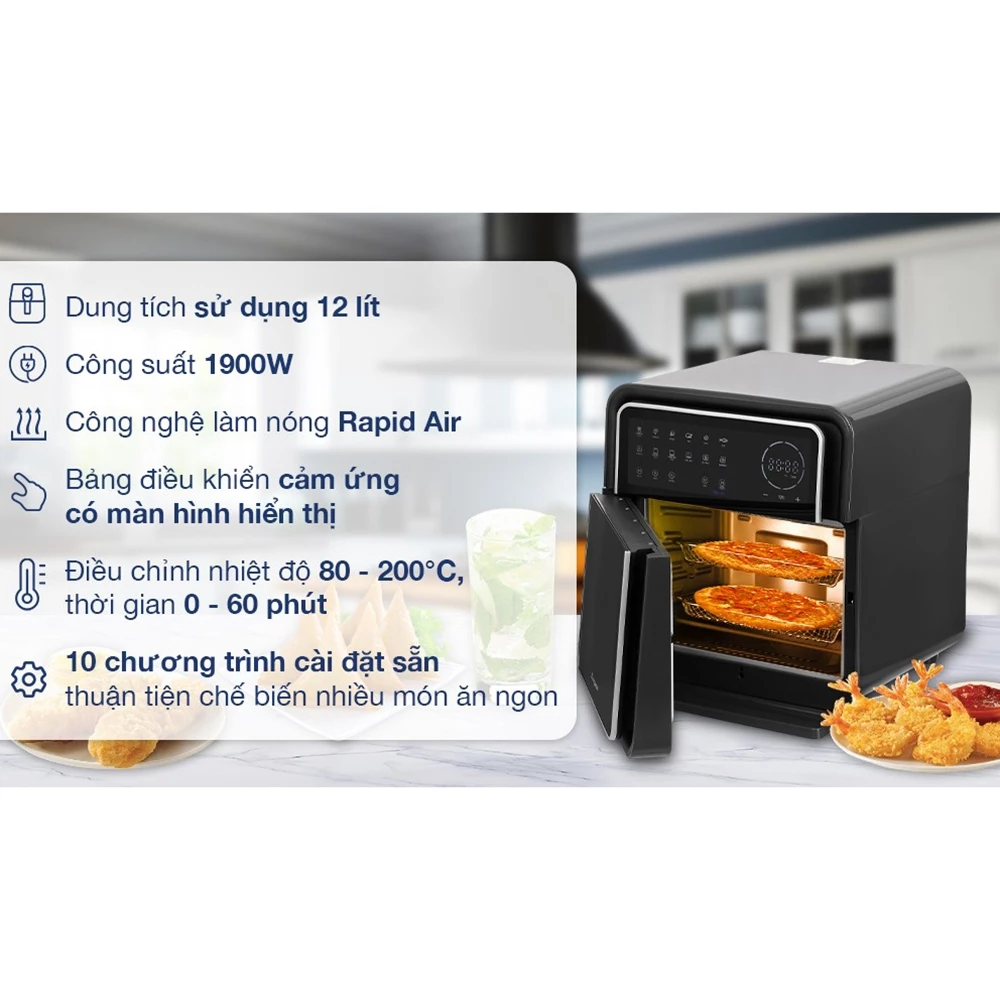Công nghệ Rapid Air kèm bộ phận gia nhiệt kép trên và dưới giúp luồng khí nóng tuần hoàn đều. Mang đến thực phẩm chín đều và nhanh chóng. Thưởng thức những miếng rán giòn, vàng ươm và loại bỏ đến 85% chất béo so với chiên nướng truyền thống.