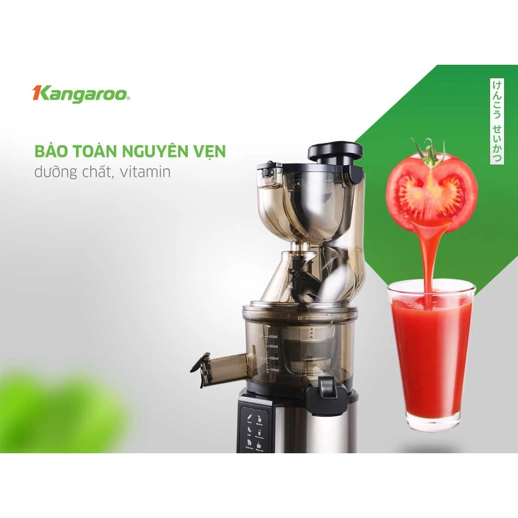 Công nghệ ép ly tâm trong máy thông thường có tốc độ ép cao làm phát sinh nhiệt, phá vỡ cấu trúc vitamin và dưỡng chất có trong hoa quả. Với công nghệ ép chậm trong máy ép Kangaroo làm giảm ma sát, không phát sinh nhiệt, bảo toàn tối đa dưỡng chất và vitamin.