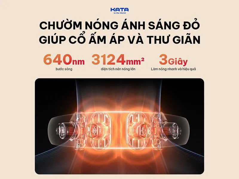 - Chườm nóng 3 mức nhiệt (37℃–39℃–42℃): Diện tích phủ 3124mm², làm ấm đều, thư giãn cơ căng cứng.