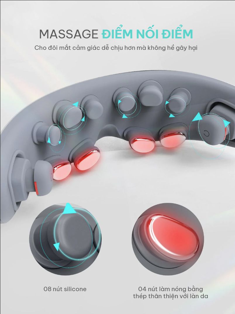 - 2 đầu massage thái dương: Xoay linh hoạt, kích thích huyệt đạo quanh thái dương, giảm đau đầu, căng thẳng do áp lực công việc.