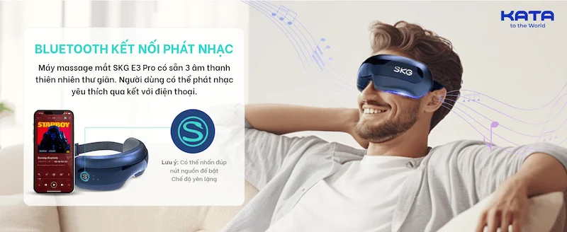 Máy massage mắt SKG E3 Pro được trang bị tính năng phát nhạc qua Bluetooth để dễ dàng kết nối với điện thoại. Người dùng có thể lựa chọn các bản nhạc yêu thích sử dụng giai điệu thiên nhiên dịu nhẹ, từ đó tạo nên không gian lý tưởng để giải tỏa căng thẳng và đưa tâm trí trở về trạng thái cân bằng.
