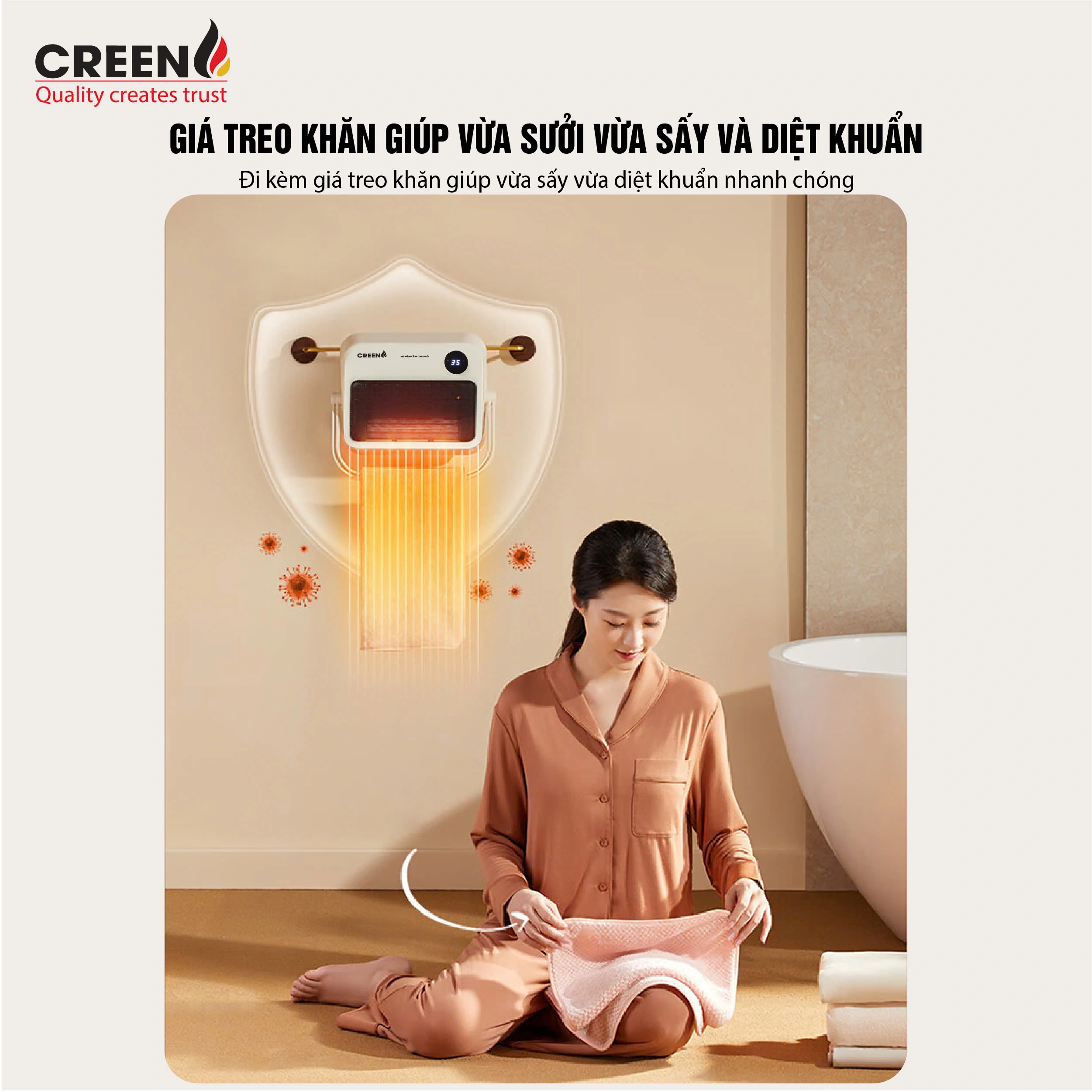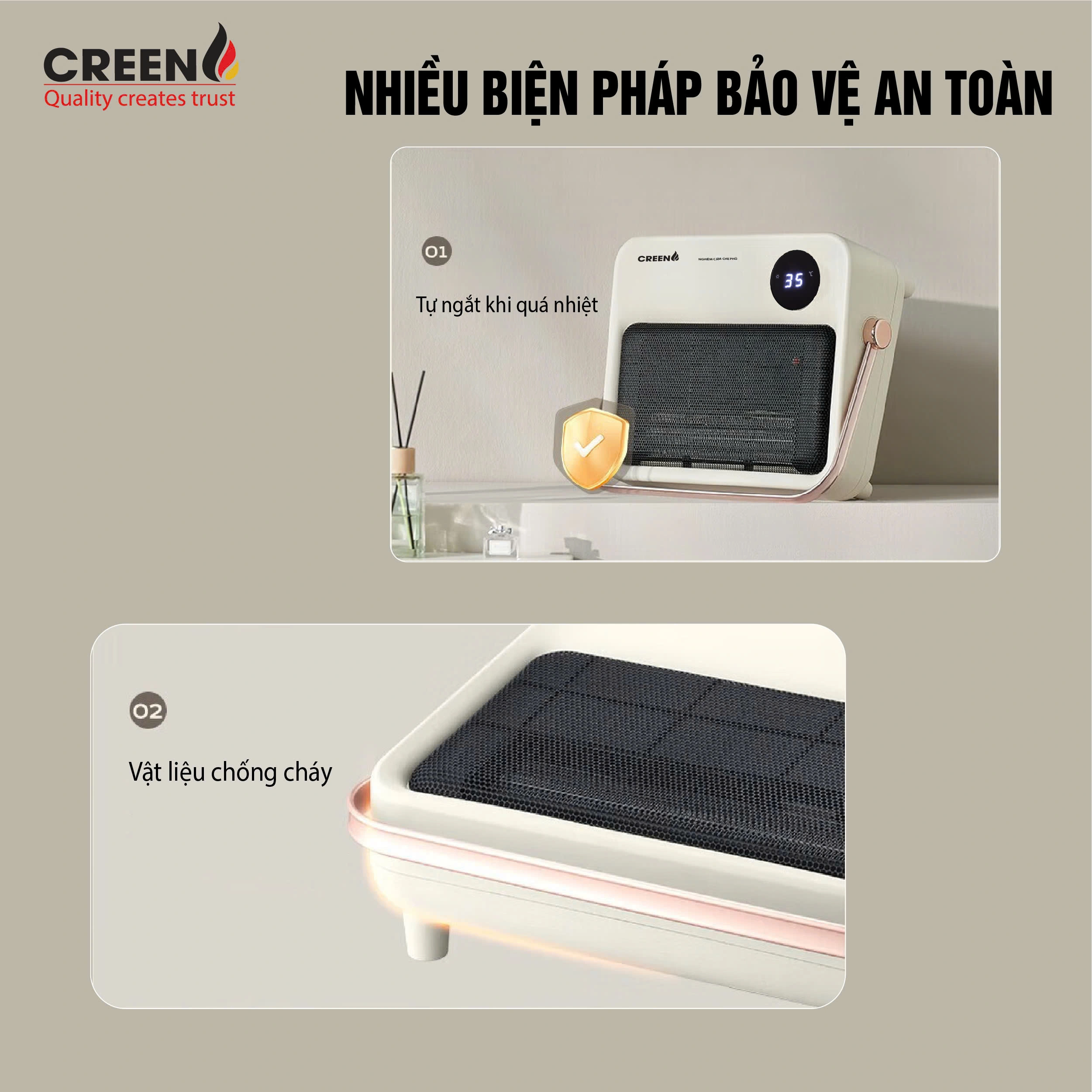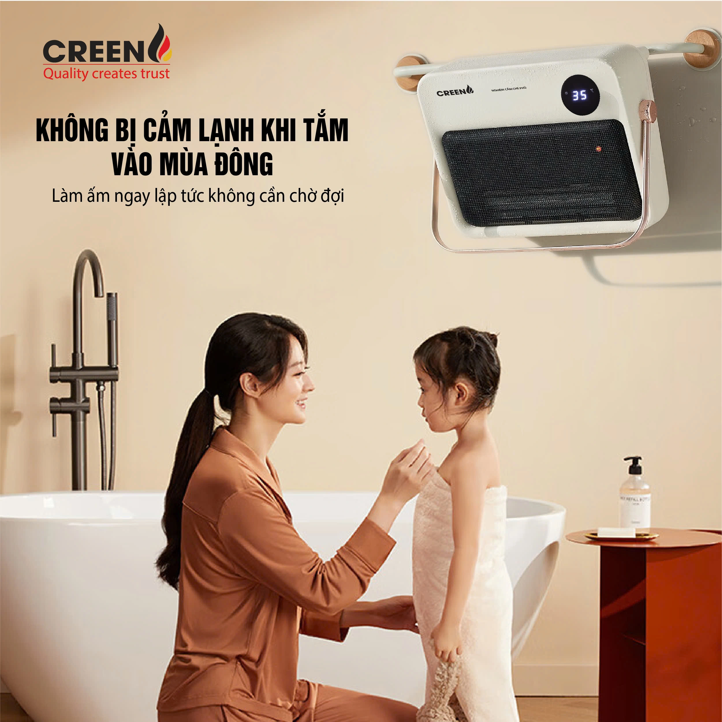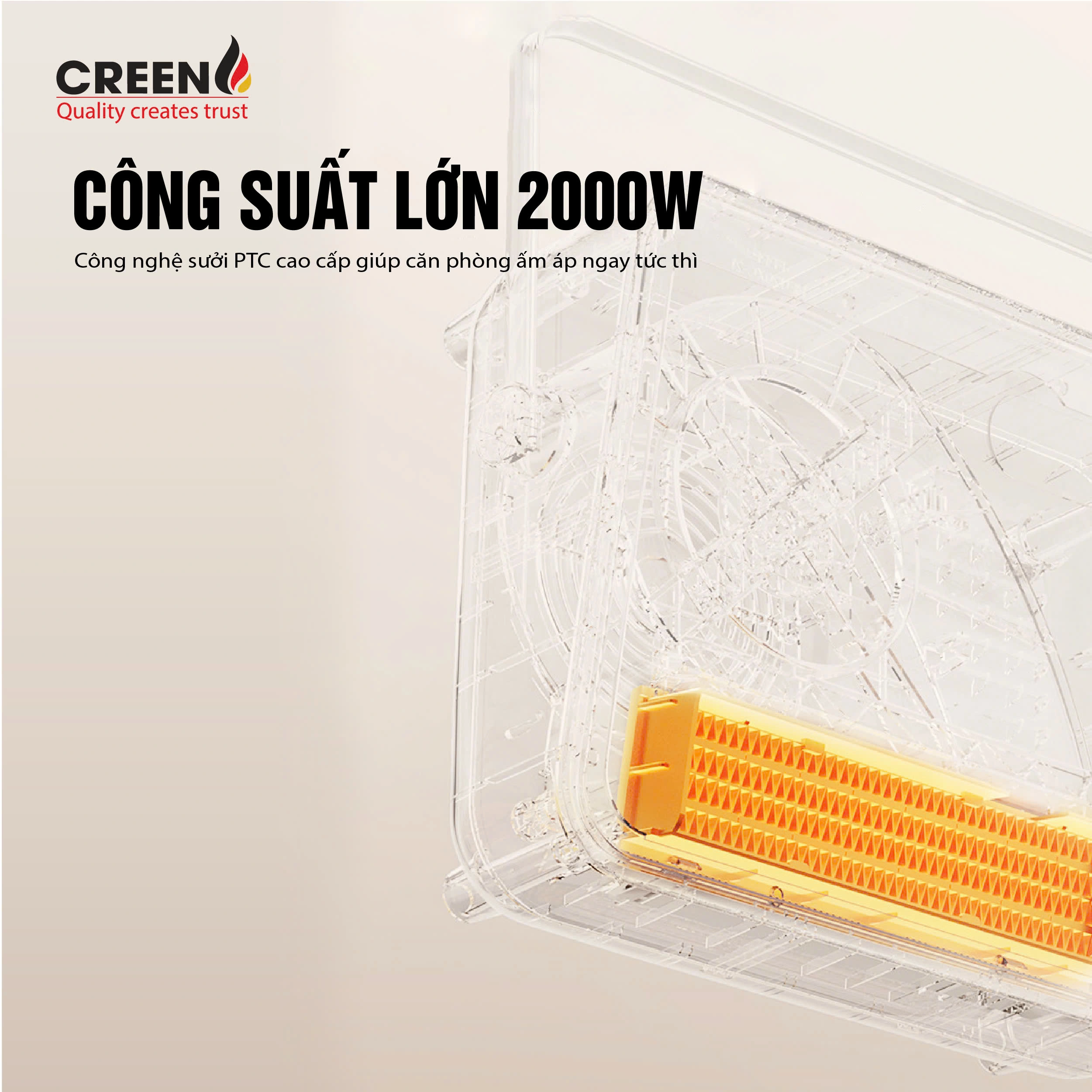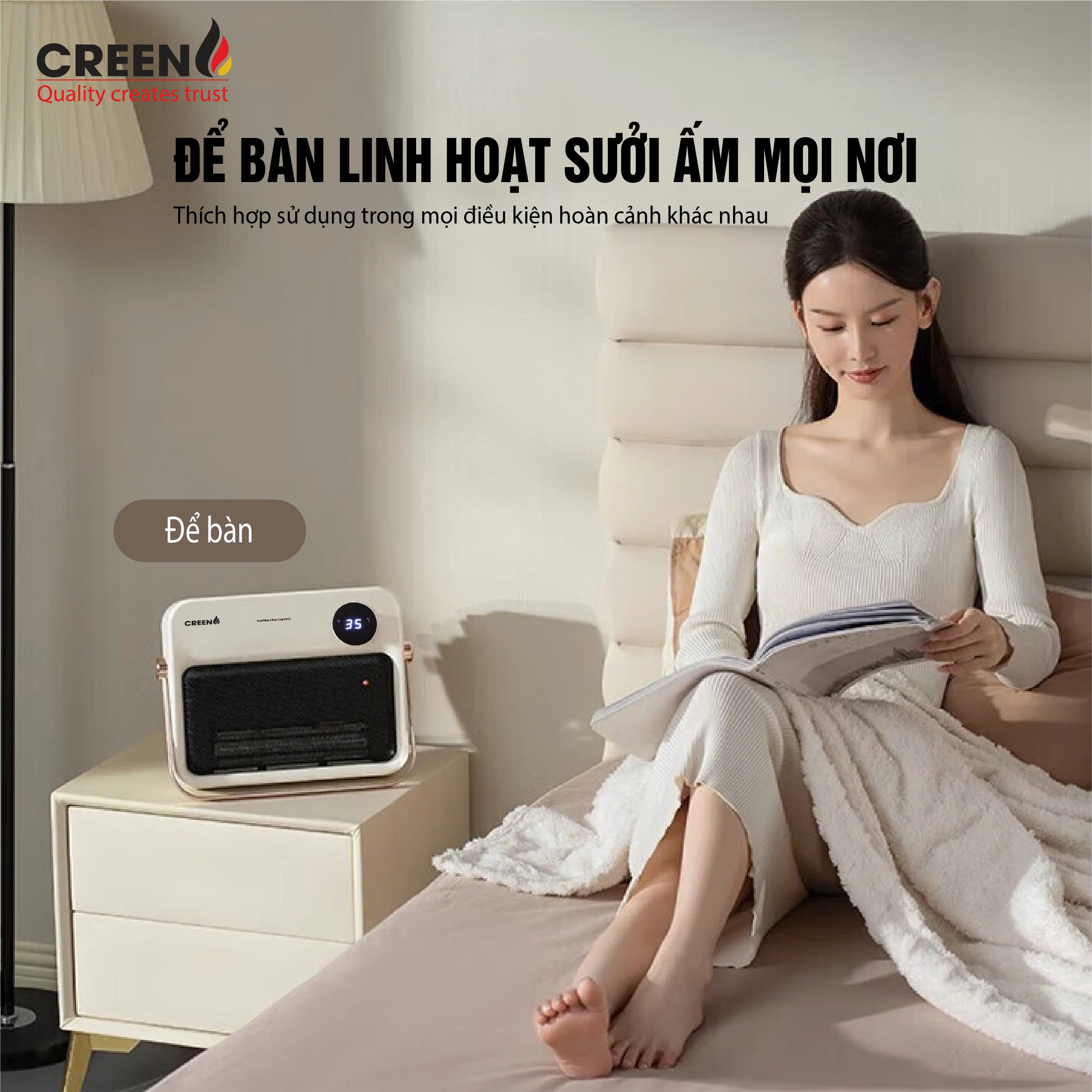 Máy sưởi CREEN H38DT là dòng máy sưởi gốm cao cấp, phù hợp sử dụng cho không gian phòng vừa và lớn, mang lại cảm giác ấm áp nhanh chóng, an toàn và tiện lợi trong mùa lạnh.