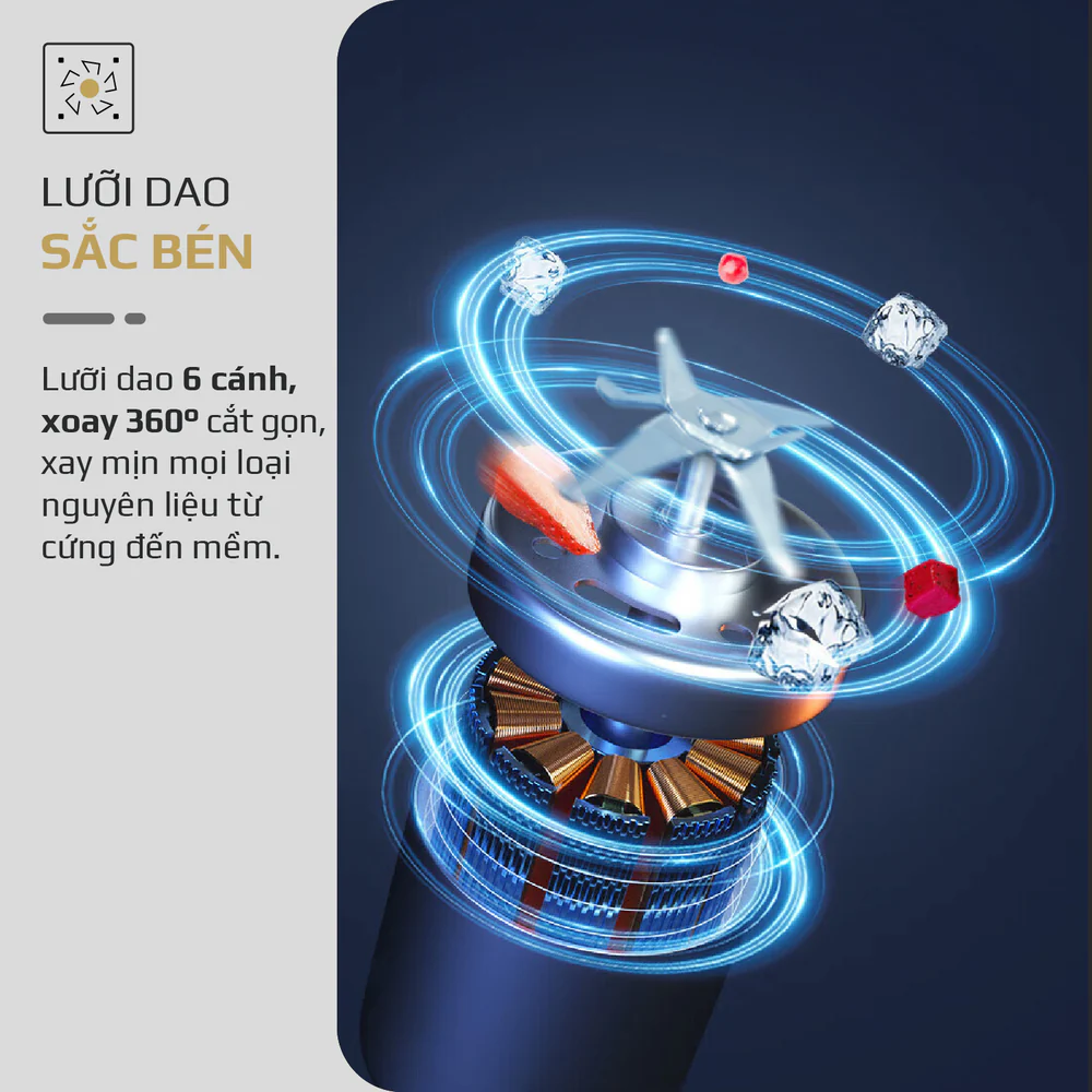 Xay mịn nhanh chóng: Lưỡi dao inox 304 6 cánh sắc bén, tốc độ quay mạnh mẽ, dễ dàng xay nhuyễn hoa quả, đá nhỏ, hạt mềm.