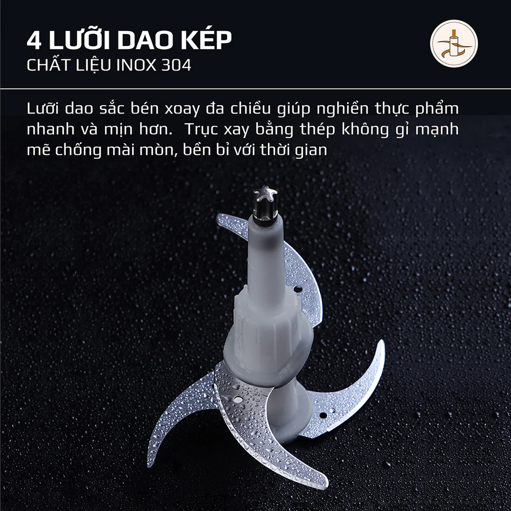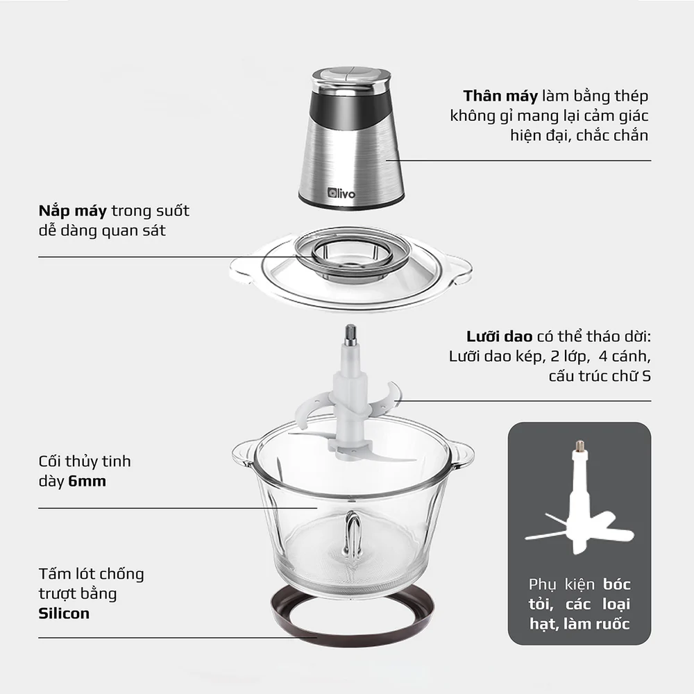 Lưỡi dao kết hợp có thể tháo rời, khi xay số lượng thịt ít chỉ cần lắp ráp 01 lưỡi dao, khi xay số lượng thịt nhiều có thể lắp ráp 02 lưỡi dao vào cùng lúc, xay nhuyễn thực phẩm thật dễ dàng.Cối thủy tinh dễ dàng vệ sinh bề mặt, giúp cối luôn được sáng bóng, sạch sẽ đảm bảo an toàn vệ sinh thực phẩm sau khi sử dụng máy.6. CÔNG SUẤT MẠNH MẼ LÊN ĐẾN 500W