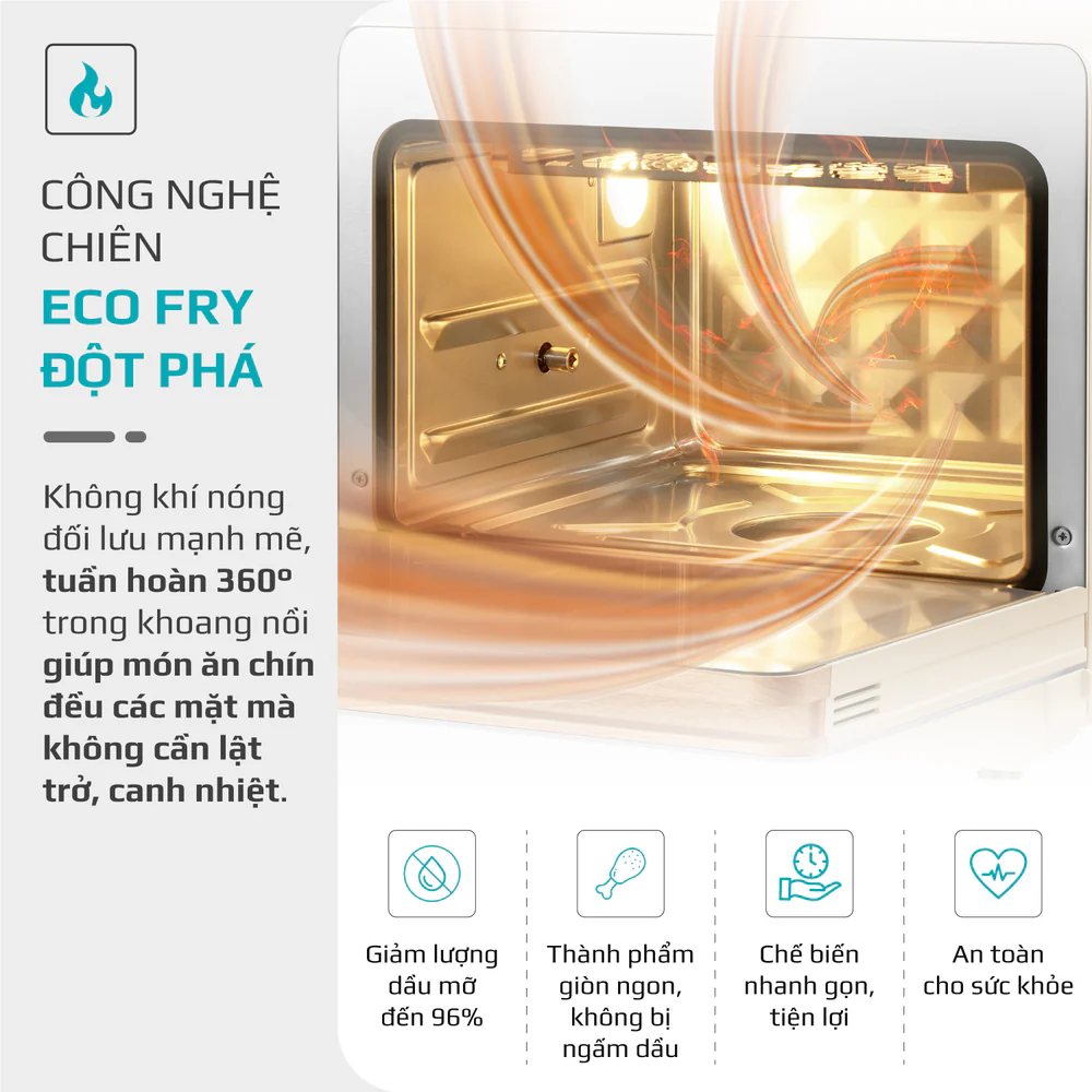 - Công nghệ 3 trong 1: Chiên không dầu – Hấp – Nướng kết hợp, giúp thực phẩm chín đều, giữ trọn vị ngon và dưỡng chất, hạn chế dầu mỡ