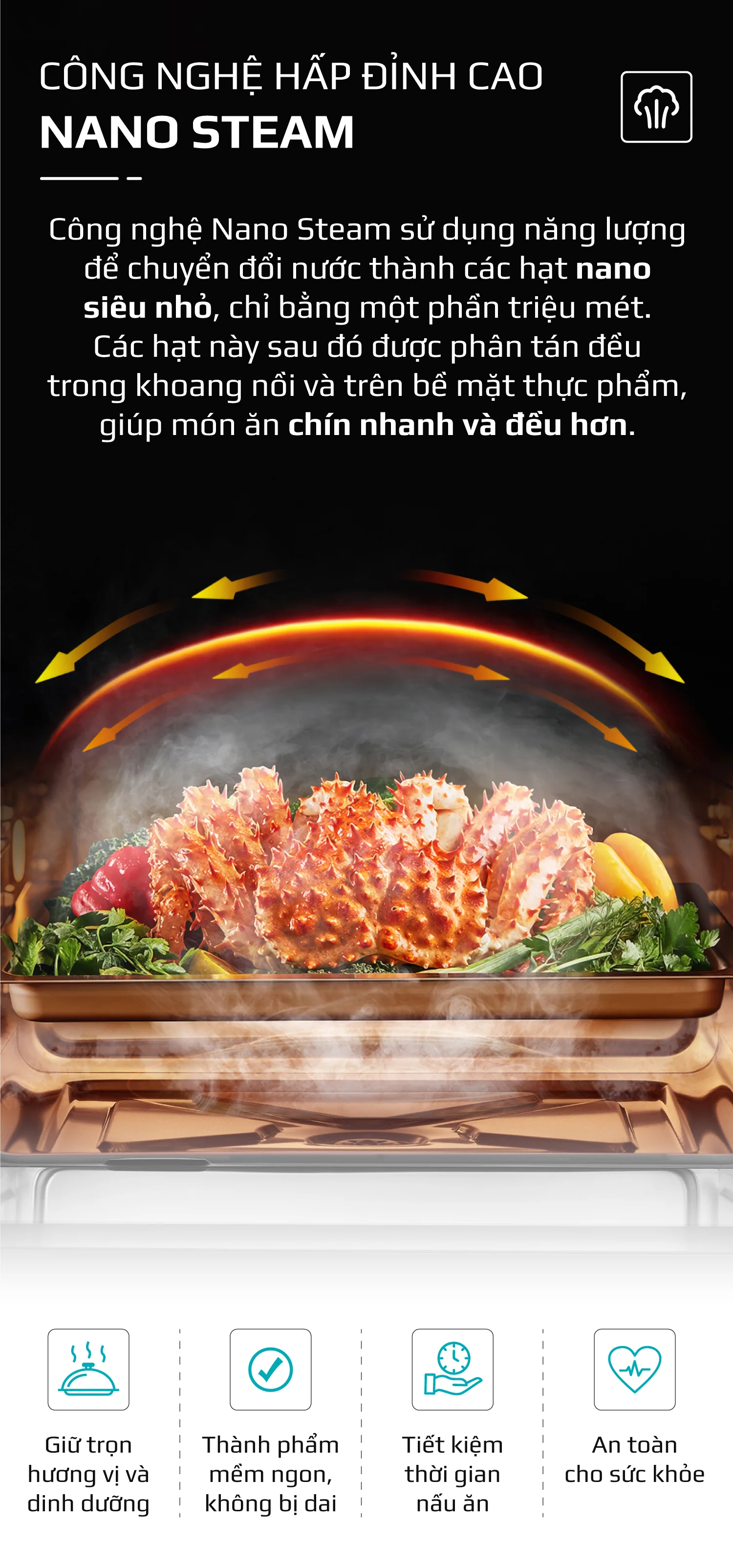 - Công nghệ Steam Active: Hơi nước siêu nhiệt giúp món ăn không bị khô, giữ màu sắc tươi ngon và kết cấu mềm mọng.