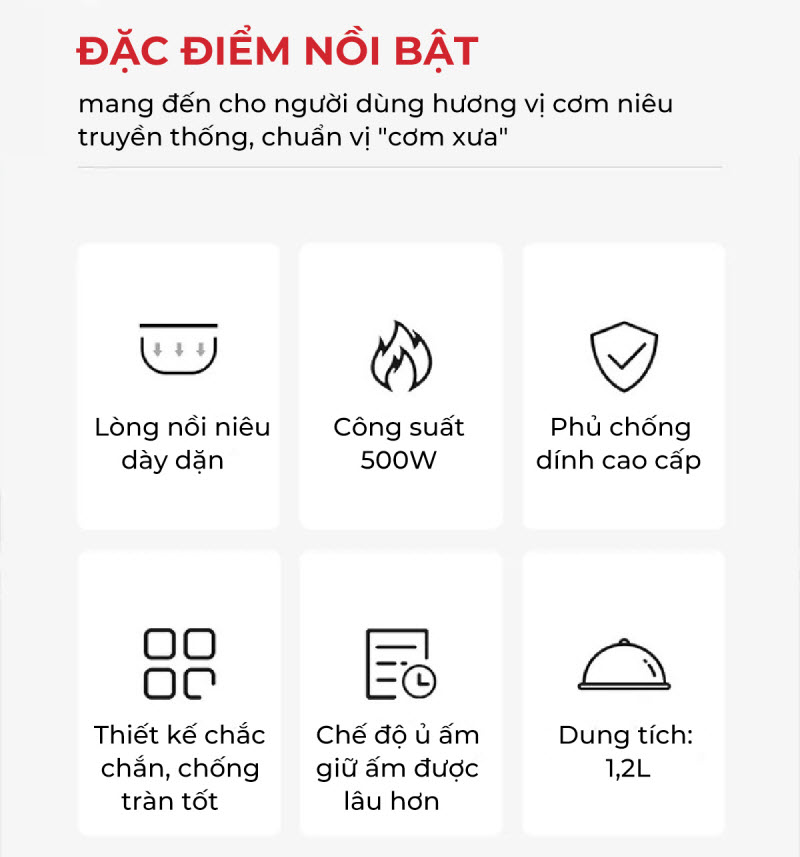 Lòng nồi niêu dày 2.0mm: Hợp kim nhôm phủ chống dính cao cấp, an toàn, giúp cơm chín đều, dẻo thơm.