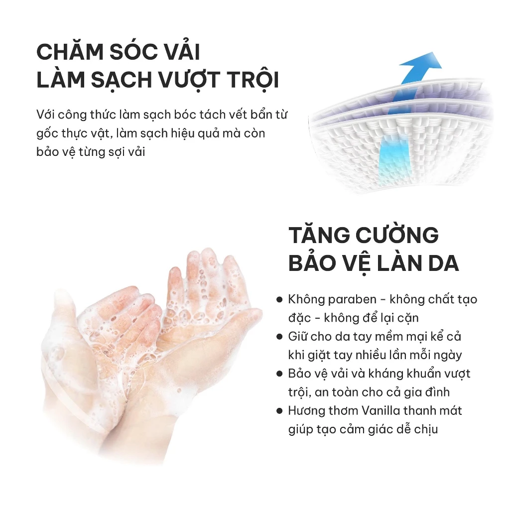 • Làm sạch sâu đến từng sợi vải, loại bỏ bụi bẩn – mồ hôi – vi khuẩn mà không cần dùng nước nóng