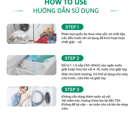 Dùng 1/2 nắp cho 10–15 chiếc quần áo