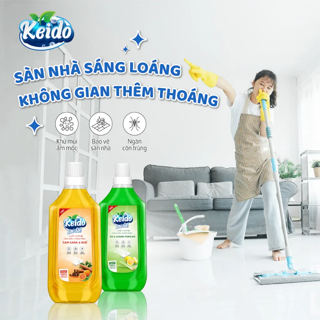 - Giữ cho ngôi nhà luôn sạch sẽ, thơm mát và an toàn cho cả gia đình không chỉ là thói quen mà còn là nhu cầu thiết yếu trong cuộc sống hiện đại. Nước lau sàn KEIDO Thảo Mộc ngăn côn trùng hiệu quả mang đến giải pháp vệ sinh tối ưu với công thức kết hợp sức mạnh làm sạch vượt trội và tinh chất thiên nhiên an toàn. Mùi hương Chanh Persian tươi mát hòa quyện cùng Sả thanh khiết không chỉ giúp làm sạch sàn nhà mà còn xua đuổi kiến, gián, muỗi và các loại côn trùng khác một cách tự nhiên, không cần dùng tới hóa chất độc hại. Đây là lựa chọn hoàn hảo cho những gia đình muốn vừa bảo vệ sức khỏe, vừa giữ cho không gian sống luôn trong lành, thơm mát suốt cả ngày.
