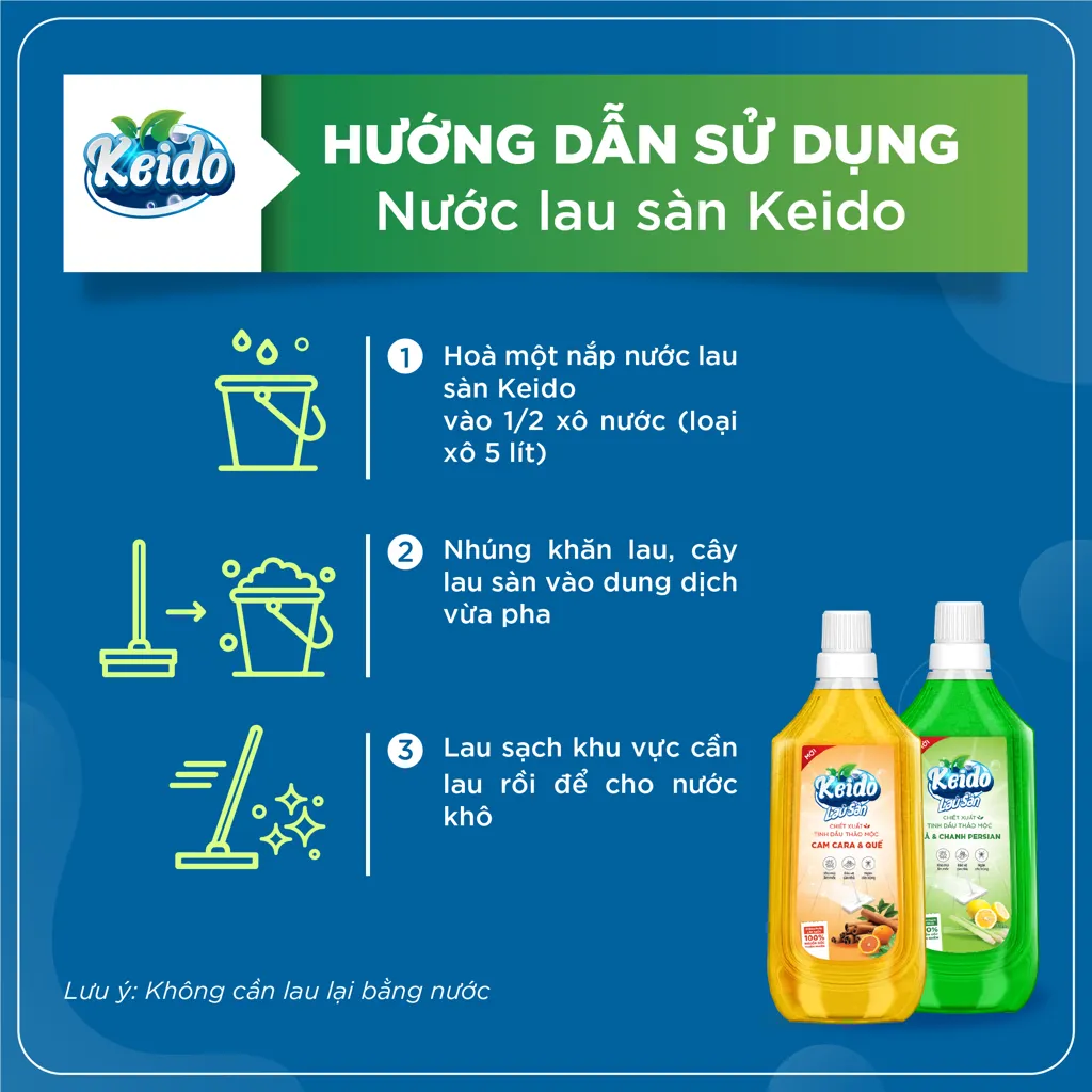 Sử dụng KEIDO thường xuyên không chỉ giúp giữ nhà cửa luôn sạch sẽ mà còn giảm nguy cơ côn trùng xâm nhập, hạn chế phải dùng thuốc diệt côn trùng độc hại. Sản phẩm còn giúp tiết kiệm thời gian dọn dẹp, vì chỉ cần một bước lau là vừa sạch vừa thơm. Với dung tích 1 lít, mỗi chai KEIDO có thể sử dụng cho nhiều tuần, tùy theo diện tích và tần suất lau dọn. Đây là giải pháp kinh tế, an toàn và hiệu quả cho mọi gia đình.