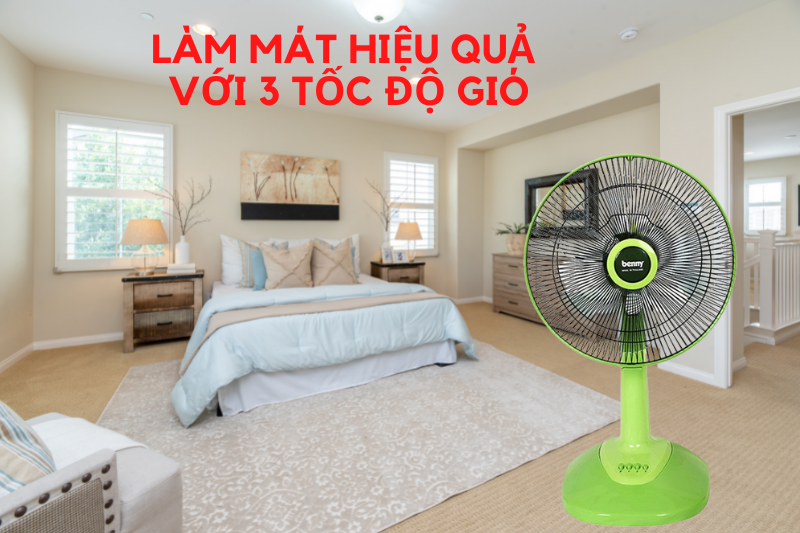 Quạt bàn Benny BFT-46-GN có công suất 60W nguồn điện 220-240V-50Hz cùng lưu lượng gió lên đến 60m3/phút giúp làm mát căn phòng một cách nhanh chóng, xua tan không khí nóng bức ngày hè, đồng thời giúp tiết kiệm điện năng hiệu quả cho gia đình bạn