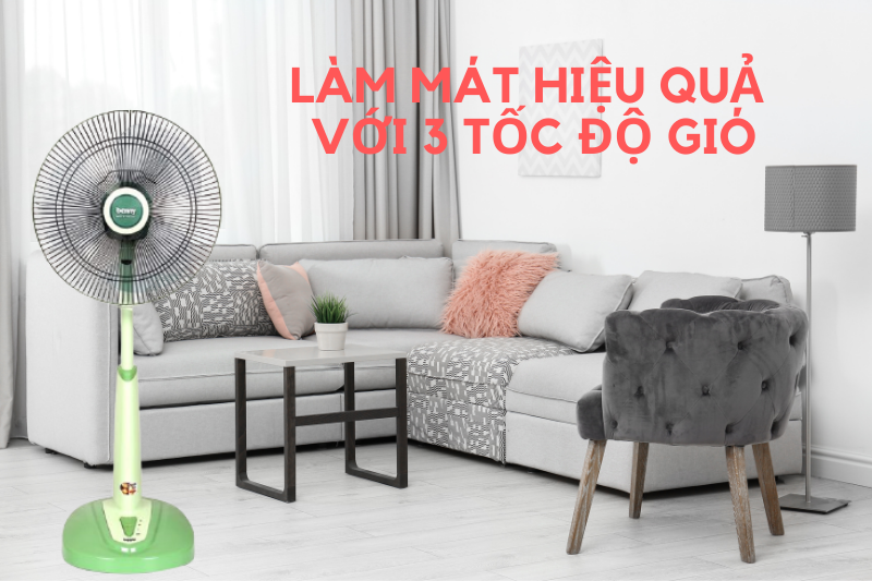 Động cơ mạnh mẽ tạo ra làn gió trải rộng, tản gió nhanh, làm mát không gian phòng hiệu quả. Chân đế có kích thước rộng giúp đứng vững chắc trên bề mặt phẳng. 3 tốc độ gió được thiết kế dưới chân đế quạt, bấm dễ dàng giúp bạn có thể lựa chọn gió nhẹ, trung bình hoặc cao tùy theo nhu cầu sử dụng.