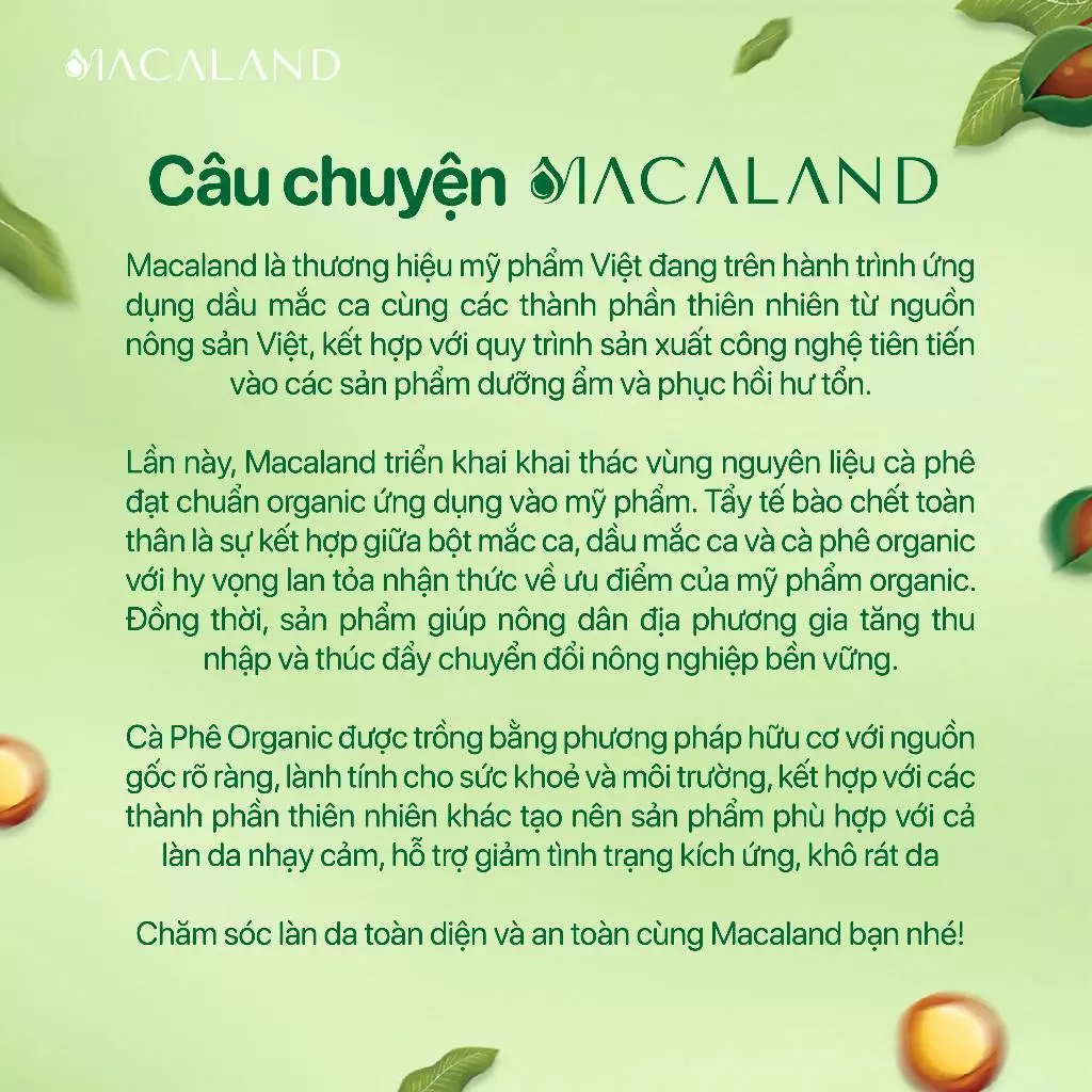 - Nên kết hợp cùng Tẩy tế bào chết Mắc Ca – Cà Phê Organic Macaland 2 lần/tuần để da được thông thoáng và đạt hiệu quả hấp thụ dưỡng chất tối ưu