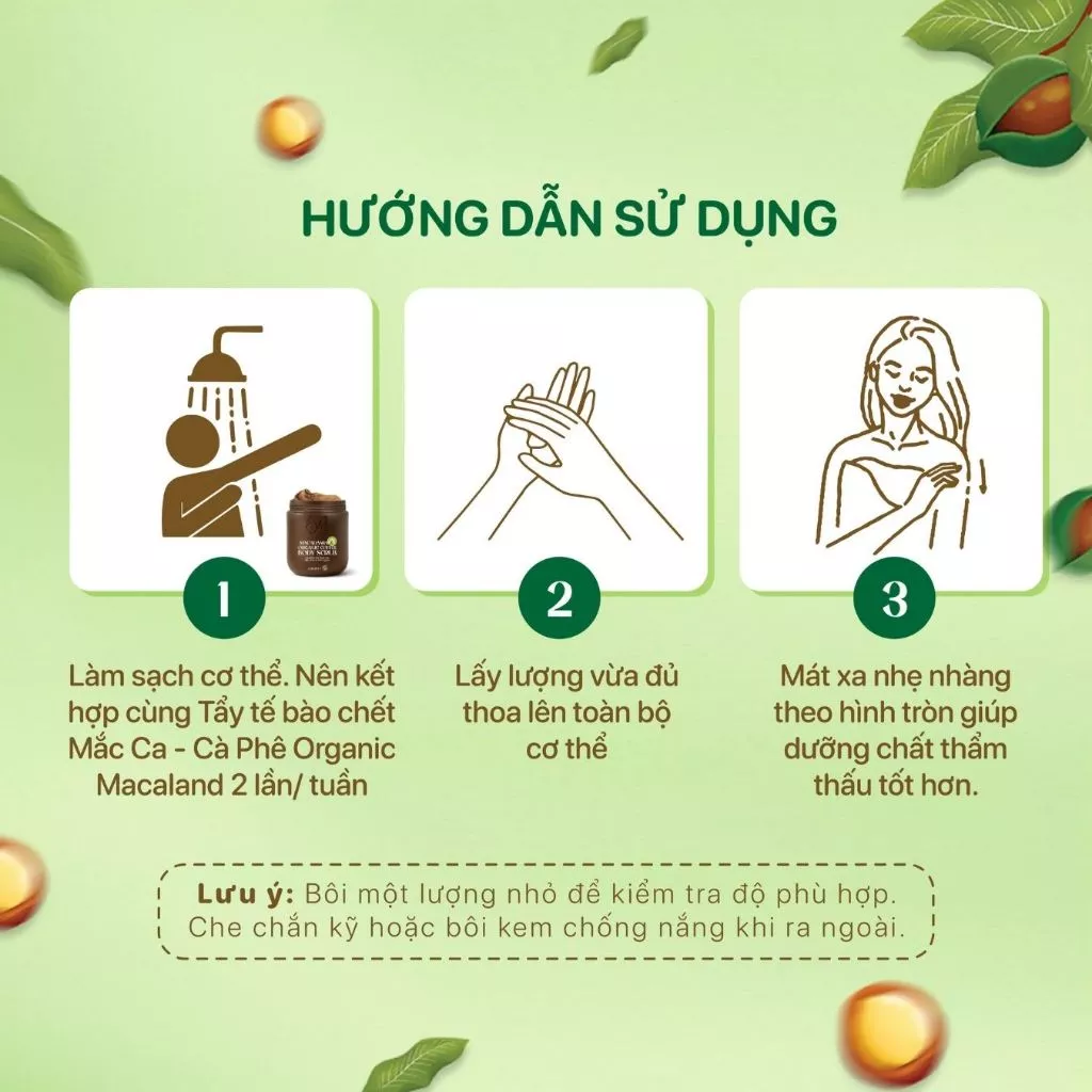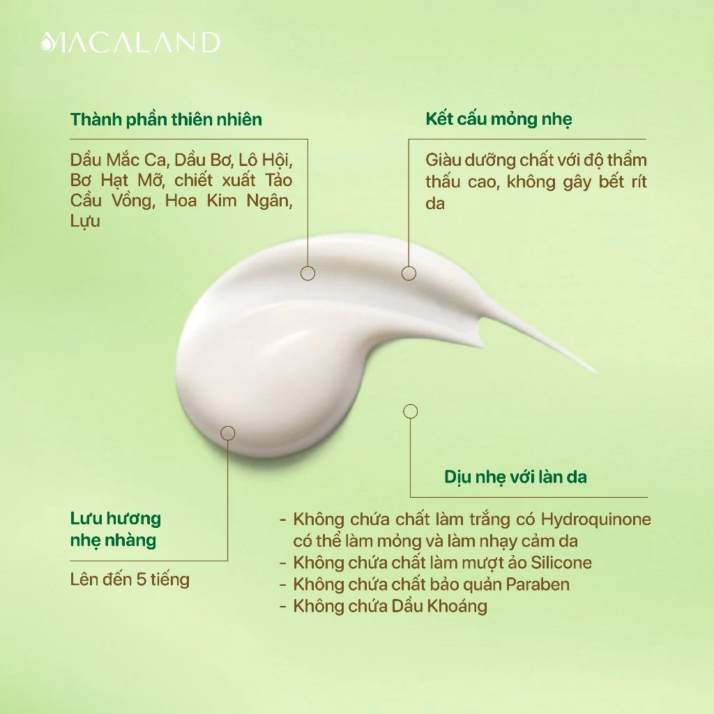 Với hàm lượng cao các thành phần thiên nhiên như Dầu Mắc Ca, Dầu Bơ Organic và Chiết xuất Tảo Cầu Vồng, Hoa Kim Ngân, Lựu, sữa dưỡng thể Mắc Ca mang đến công dụng 2 trong 1 - vừa dưỡng ẩm chuyên sâu, vừa hỗ trợ làm sáng da. Sản phẩm có hương thơm dịu nhẹ, lưu hương đến 5 tiếng tạo cảm giác thư giãn mỗi khi dùng. Đặc biệt không sử dụng Hydroquinone, Silicone, Paraben, Dầu Khoáng, dịu nhẹ với làn da.