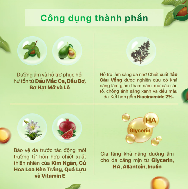 - Chiết xuất Hoa Kim Ngân, Hoa Loa Kèn và Lựu hỗ trợ dưỡng ẩm, làm dịu và sáng da, giúp bảo vệ da khỏi các tổn thương do gốc tự do và ô nhiễm môi trường