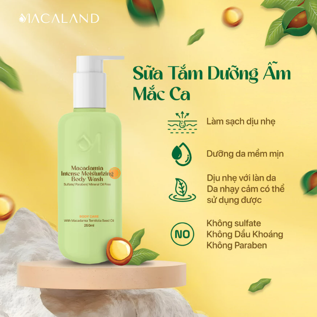 Sữa tắm chứa tinh dầu Mắc Ca giúp nuôi dưỡng và phục hồi làn da mềm mại