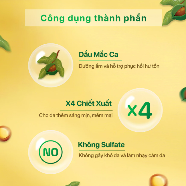 | Thành Phần Hoạt Tính | Anti-oxidants, Không chứa paraben, Không chứa sulfate, Dầu Mắc Ca |