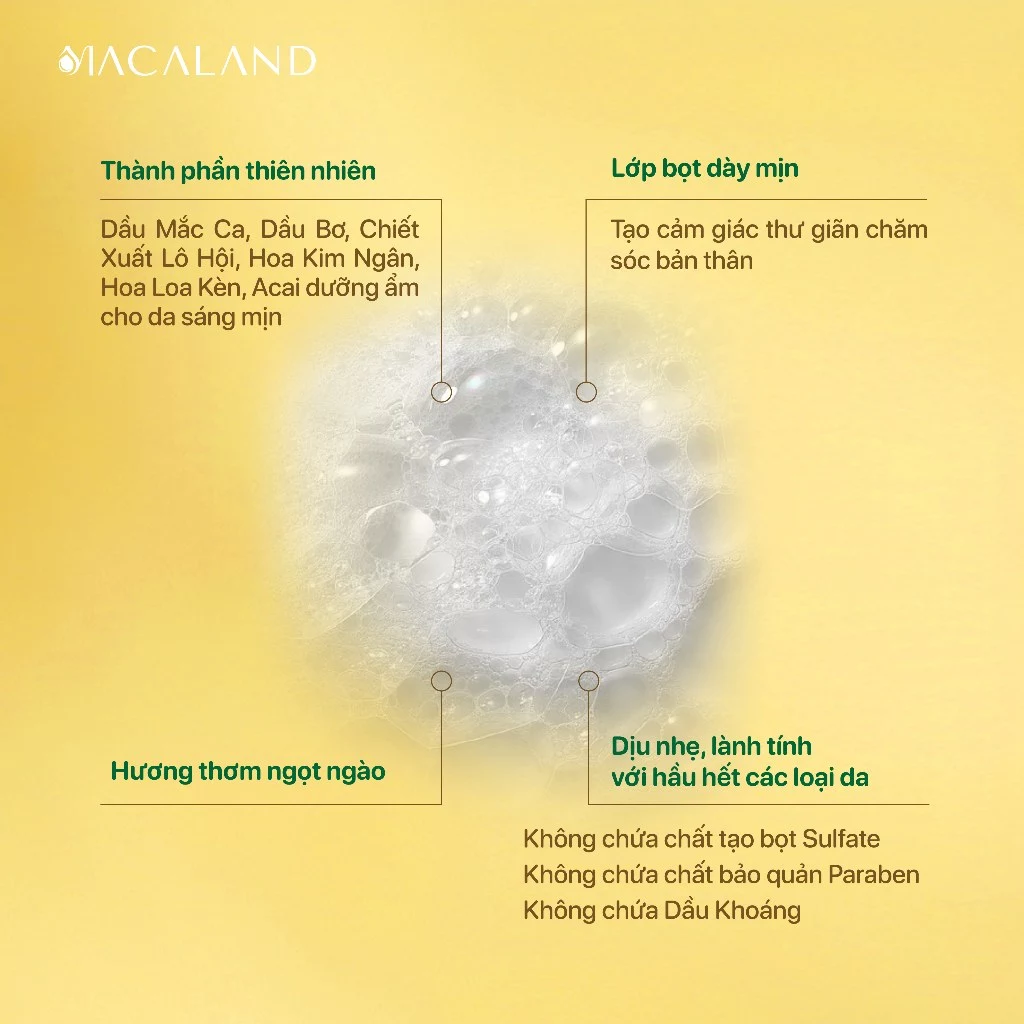Sữa tắm dưỡng ẩm Mắc Ca được thiết kế KHÔNG chứa Sulfate - chất tạo bọt phổ biến có thể gây khô và làm mất cân bằng pH của da, đồng thời tạo nên những tác động xấu đến môi trường - thay thế bằng các thành phần làm sạch dịu nhẹ hơn. Đặc biệt, sản phẩm được bổ sung đa dạng các thành phần thiên nhiên như Dầu Mắc Ca, Dầu Bơ Organic, Chiết Xuất Lô Hội, Hoa Kim Ngân, Hoa Loa Kèn và Acai cung cấp dưỡng chất cho làn da thêm ẩm mịn.