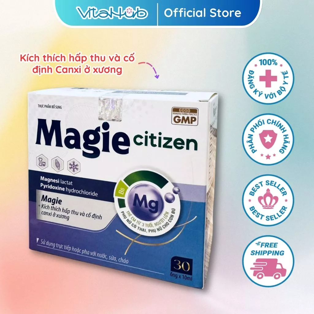 Magie Citizen là dòng thực phẩm bổ sung thiết yếu giúp bổ sung 100mg Magie nguyên tố cùng Vitamin B6 trong mỗi ống, hỗ trợ giảm mệt mỏi, căng thẳng và chuột rút hiệu quả. Sản phẩm có hương dâu dễ uống, phù hợp cho cả trẻ từ 3 tuổi, người lớn, phụ nữ mang thai và cho con bú. Đặc biệt Magie Citizen giúp kích thích hấp thu và cố định Canxi ở xương, hỗ trở trẻ tăng chiều cao hiệu quả.