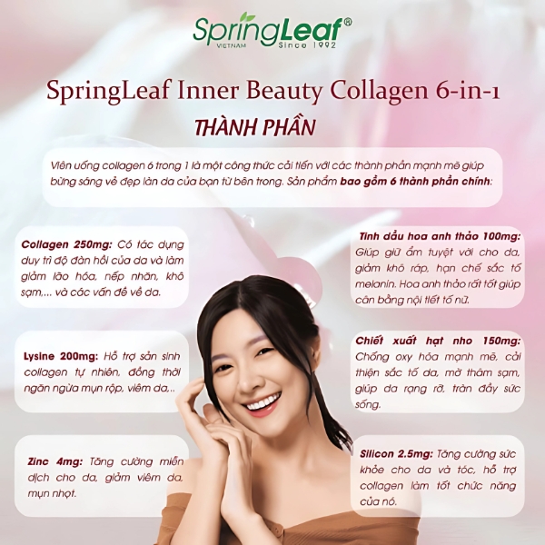 Hãy cùng khám phá chi tiết về sản phẩm này để hiểu vì sao SpringLeaf Inner Beauty Collagen 6-In-1 là bí quyết làm đẹp không thể thiếu của phái đẹp!