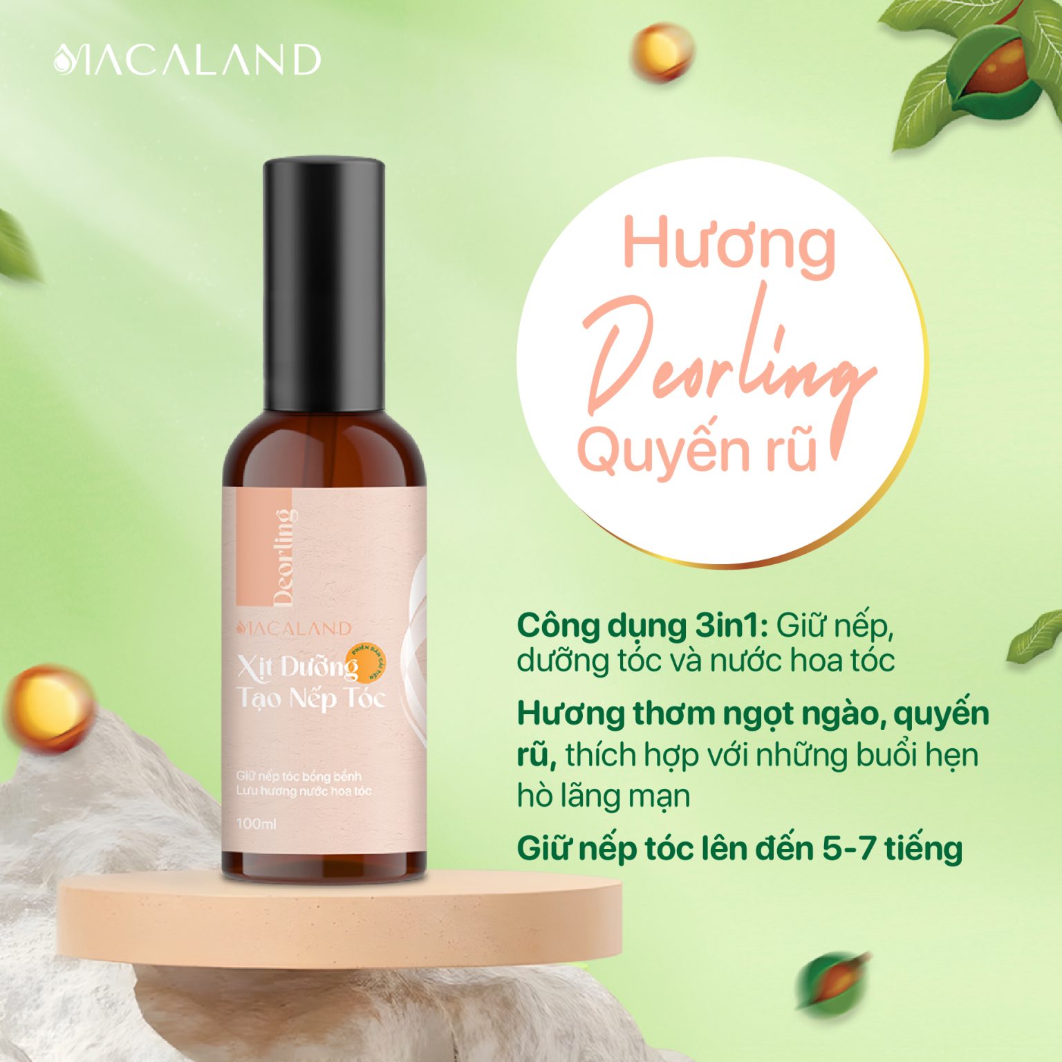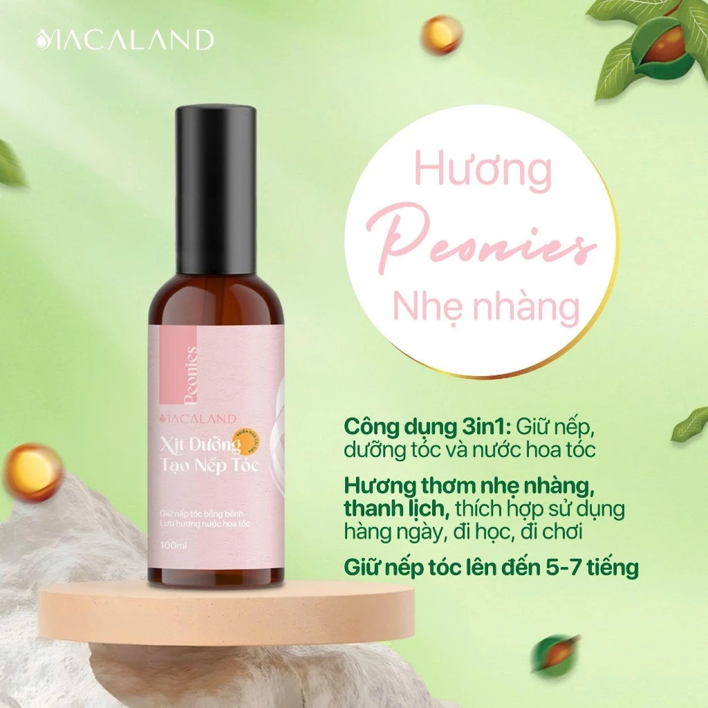 Xịt dưỡng tạo nếp tóc Macaland là dòng sản phẩm đặc biệt với 3 công dụng chính: giữ nếp tóc, dưỡng tóc và tạo hương thơm nước hoa cho tóc. Không như những chai keo xịt thông thường gây khô cứng hay bết tóc, Xịt dưỡng tạo nếp tóc Macaland giúp tóc vào nếp mà không làm mất đi sự tự nhiên, mềm mại của mái tóc, đặc biệt chứa những thành phần dưỡng tóc thiên nhiên như Dầu Mắc Ca, Chiết Xuất Lô Hội giúp bảo vệ tóc trước tác động của nhiệt và bồng bềnh suôn mượt cả ngày dài.