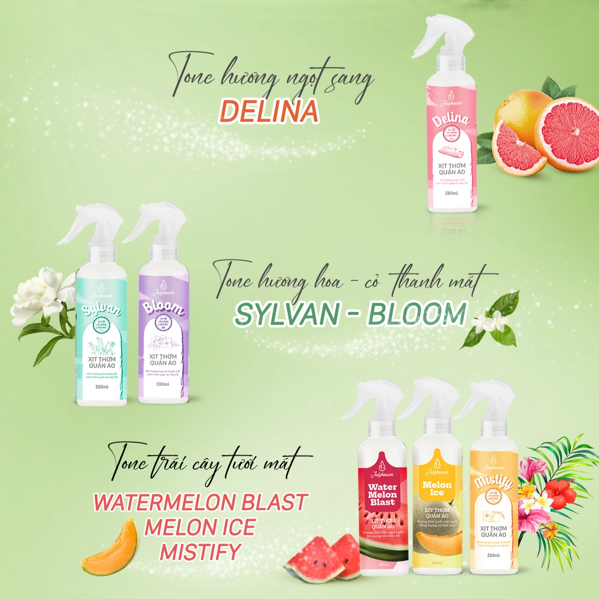 XỊT THƠM QUẦN ÁO SYLVAN (cải tiến lưu hương từ mùi VETIVER): Tone hoa cỏ nhẹ nhàng - hương hoa cỏ bài kết hợp cùng các loài hoa cỏ thơm ngát cùng tinh dầu gỗ hồng, giúp quần áo lưu hương hoa dịu nhẹ, dễ chịu.